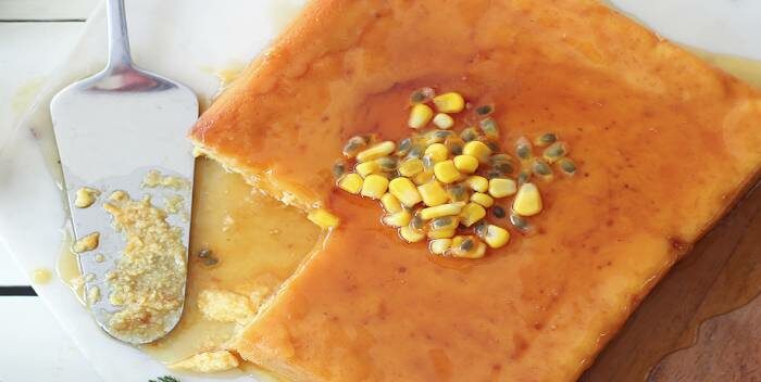 - 2 En una licuadora, mezcle todos los ingredientes para el flan y cuele la mezcla para asegurarse de que no queden pedazos de maíz o grumos. reservar