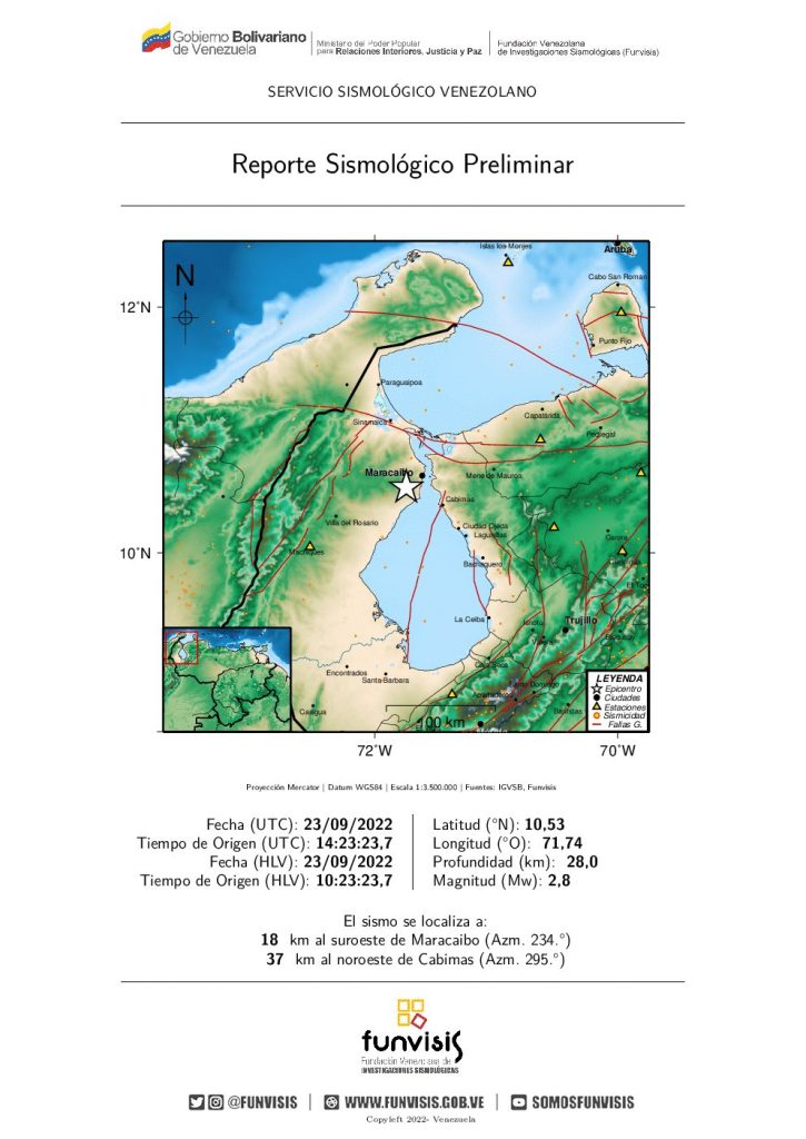 «Sismo No Sentido 23/09/2022 10:23 Mag (Mw): 2.8 Prof: 28.0 km Epicentro: 10.53 N 71.74 O 18 km al suroeste de Maracaibo»