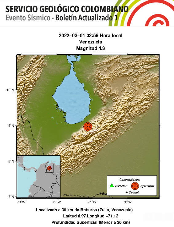 “Evento Sísmico Internacional – Boletín Actualizado 1, 2022-03-01, 02:59 hora local. Magnitud 4.3, Profundidad superficial, Venezuela”, indica la publicación.