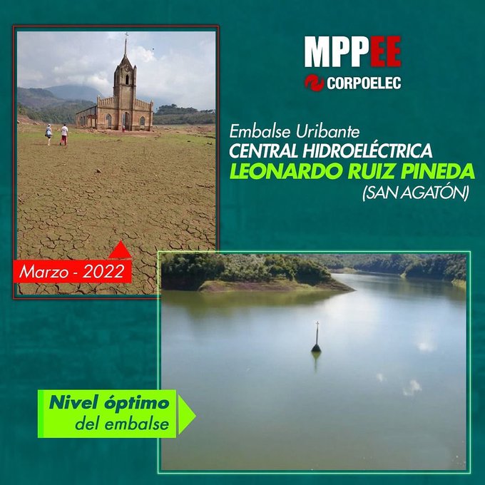 «La cota de agua actual es de 1068,56 msnm, de acuerdo a la imagen donde se evidencia la estructura completa de la iglesia de Potosí, al contrario de cuando este embalse se encuentra en los niveles óptimos y solo se aprecia la parte de la cruz de la cúpula», explicó.