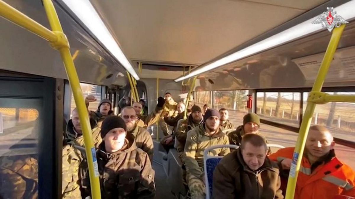 En un video compartido por el ministerio, se ve a hombres vestidos con ropa militar bajando de un autobús y haciendo llamadas telefónicas. “Todo está bien, vivo y bien. Pronto estaré en casa”, dijo un hombre.