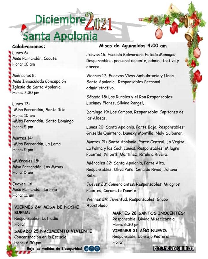 Desde este lunes #6-Dic la localidad de Santa Apolonia, municipio Tulio Febres Cordero del estado Mérida, a través de la iglesia católica y su párroco Nelvis Quintero, estará realizando una serie de eventos religiosos con motivo a la navidad.