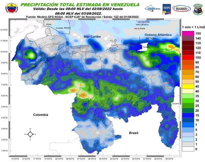 «La Zona de Convergencia Intertropical muy activa, es reforzada por Divergencia del viento en la alta tropósfera (favoreciendo los ascensos de las masas de aire cálidas y húmedas desde superficie); situación meteorológica que origina abundante nubosidad, algunas de gran desarrollo vertical con lluvias o chubascos, descargas eléctricas y eventuales ráfagas de viento, en zonas del Zulia, los Andes, Llanos Occidentales, Centrales, este de Sucre y Monagas, Delta Amacuro, Amazonas y Bolívar», señaló Indmeh en su reporte diario en redes sociales.