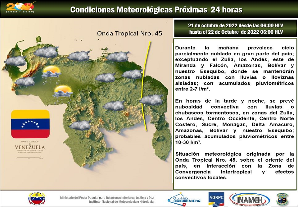 Inameh informó en su reporte diario en redes sociales que en horas de mañana prevalecerá el cielo parcialmente nublado en gran parte del país, exceptuando Zulia, Los Andes, Este de Miranda y Falcón, Amazonas, Bolívar y el Esequibo, donde se mantendrán lluvias aisladas.