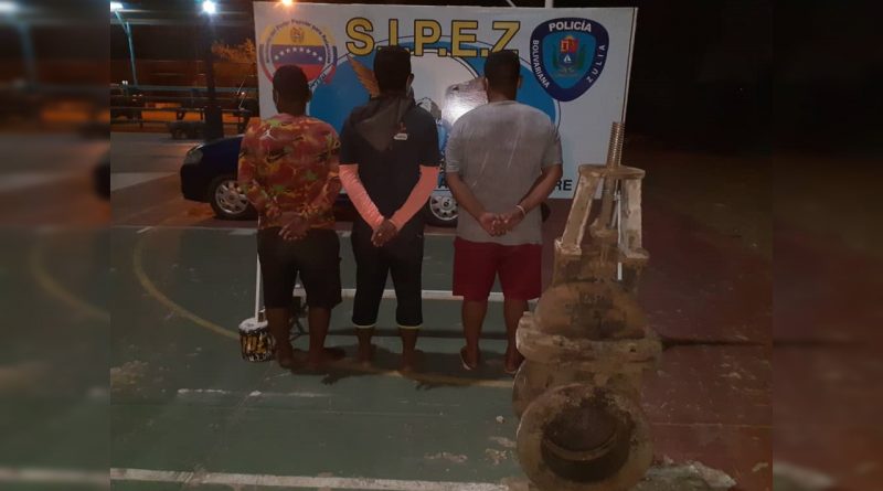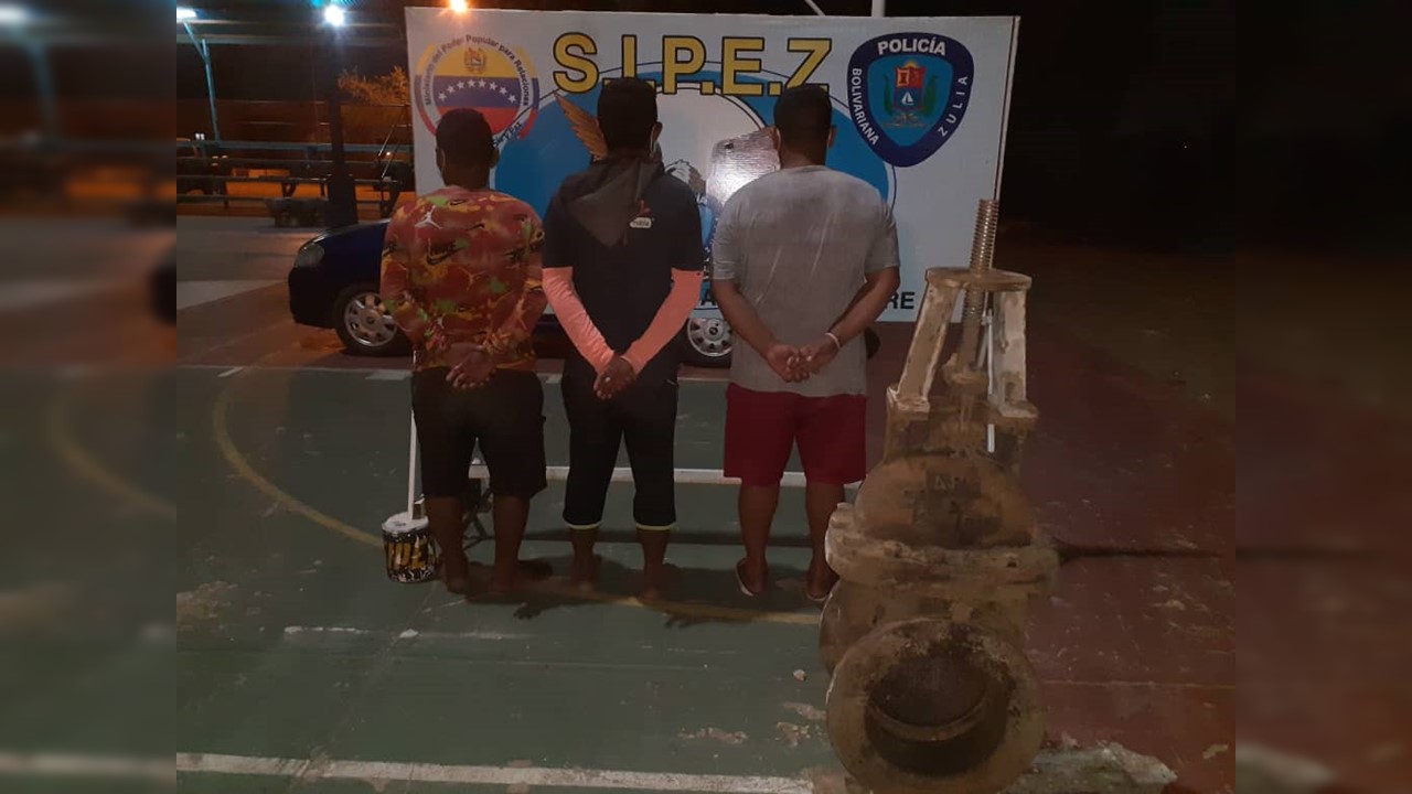 Funcionarios del Servicio de Investigaciones Penales del estado Zulia (SIPEZ) adscrito al Cuerpo de Policía Bolivariana del estado Zulia (CPBEZ) durante labores de investigación de campo y saturación de área, lograron la aprehensión en flagrancia de tres individuos quienes arrastraban una enorme válvula o llave de paso tipo industrial.