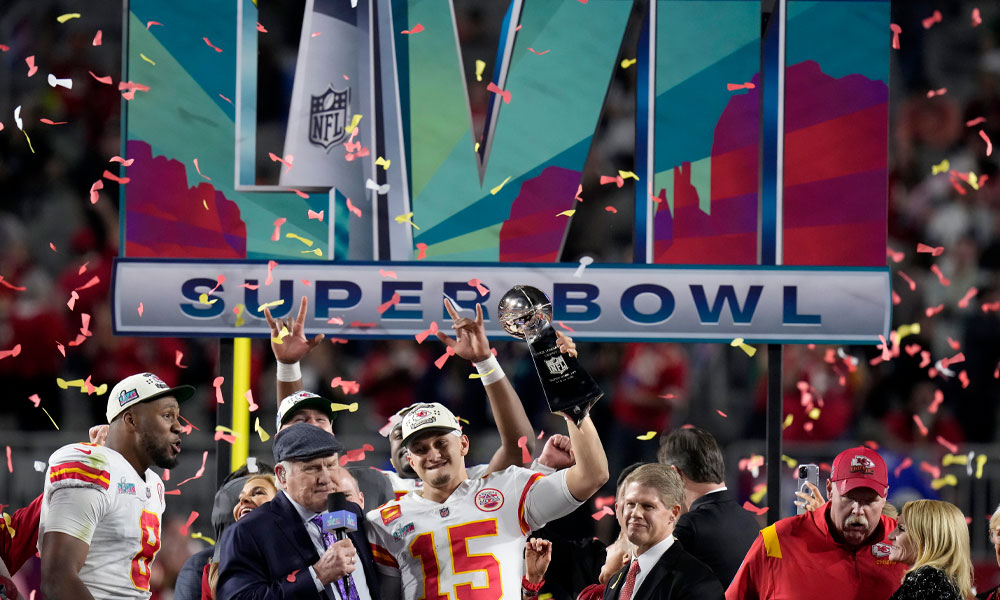 Con los Chiefs Patrick Mahomes, quien pasó para tres anotaciones a pesar de estar lesionado del tobillo, se convirtió en el primer jugador de este siglo que obtiene el premio de Jugador Más Valioso (MVP) de la temporada regular, del Super Bowl y el título de la NFL en la misma campaña.