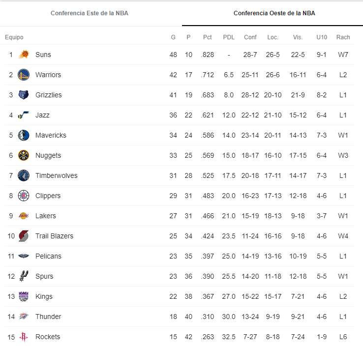 El resto de la tabla sigue igual que en las últimas jornadas, aunque Denver acecha muy de cerca a Dallas y los Lakers tratan de recortar distancia como pueden respecto a los 5 primeros, aunque aún lejos. El favorito de muchos, Golden State, se mantiene en el segundo lugar.