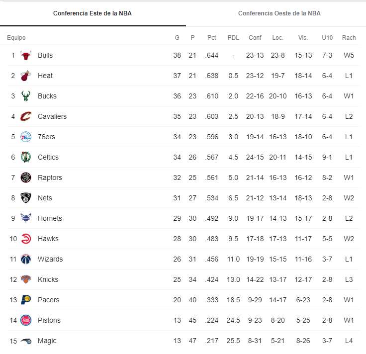 Los Nets de Brooklyn, que se ubican octavos en la tabla, se acercan a 6 partidos del primer lugar gracias a sus dos victorias consecutivas. El Heat y los Bucks se mantienen al acecho de Chicago, en el segundo y tercer puesto, respectivamente.