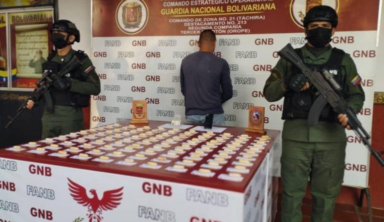 Leer másUn hombre fue capturado por la Guardia Nacional Bolivariana (GNB) en el estado Táchira con varios dediles de cocaína. Según