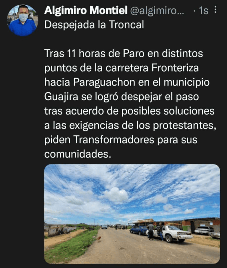 El paro que se generó en distintos puntos de la carretera Fronteriza hacia Paraguachón en el municipio Guajira se logró despejar el paso tras acuerdo de posibles soluciones a las exigencias de los protestantes, piden Transformadores para sus comunidades.
