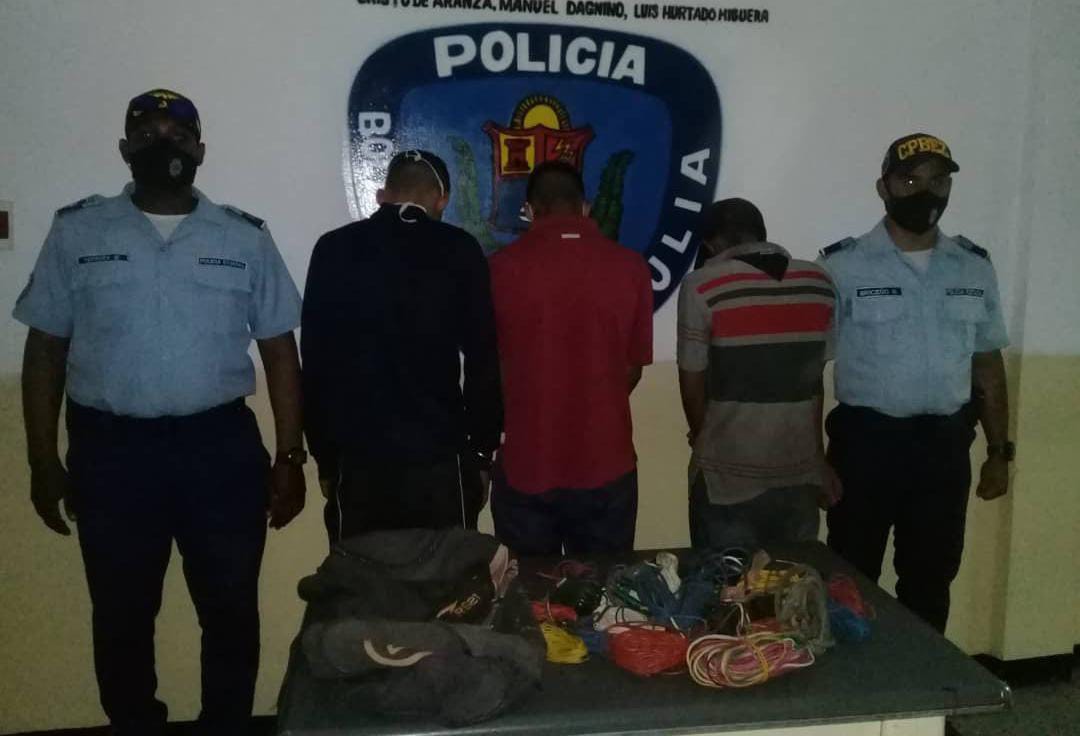 Funcionarios de servicio en el Cuadrante de Paz N° 24 del Centro de Coordinación Policial Maracaibo Sur del Cuerpo de Policía Bolivariana del estado Zulia (Cpbez), detuvieron a Carlos Alberto Godoy Villasmil (32), Anthony José Uzcátegui Espinoza (20) y Yhoandry Javier Chacín Alvarado (25) cuando hurtaban material eléctrico de la iglesia católica La Milagrosa, ubicada en el sector Haticos, parroquia Cristo de Aranza, municipio Maracaibo.