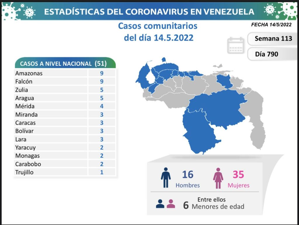 Precisó que Amazonas es el estado que este sábado 14, registra el mayor número de casos comunitarios (9), con contagios activos en 1 municipio; le siguen las entidades: Falcón (9), Zulia (5) y Aragua (5).